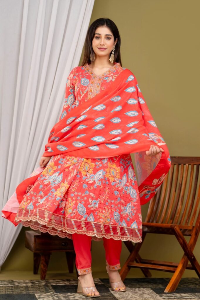 When fashion meets functionality, you get an outfit like this. The breathable cotton fabric, artistic embroidery, and vibrant orange shade come together to give you a wardrobe essential. No matter the occasion, the Cotton Shifflee 3 Pc Suit is your go-to choice for blending elegance and comfort effortlessly.