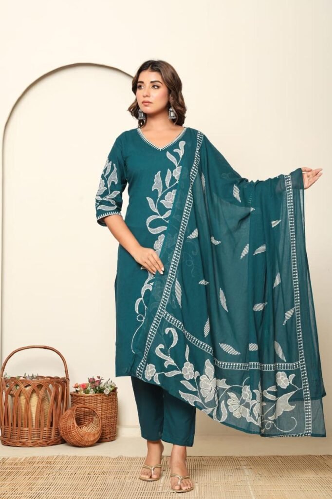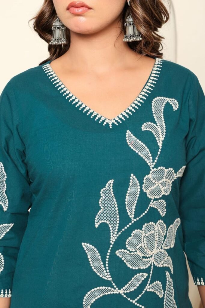 Elevate your ethnic wardrobe with this elegant Teal Blue Cotton Embroidered Kurta Set. Designed with intricate white floral embroidery, it features a V-neckline, three-quarter sleeves, and a matching dupatta that adds a graceful charm. Perfect for festive occasions, office wear, or family gatherings, this outfit combines comfort and sophistication effortlessly.