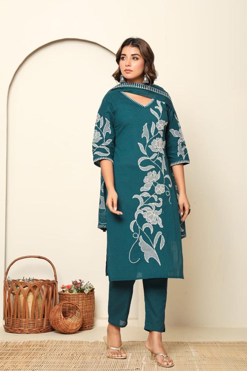 Elevate your ethnic wardrobe with this elegant Teal Blue Cotton Embroidered Kurta Set. Designed with intricate white floral embroidery, it features a V-neckline, three-quarter sleeves, and a matching dupatta that adds a graceful charm. Perfect for festive occasions, office wear, or family gatherings, this outfit combines comfort and sophistication effortlessly.